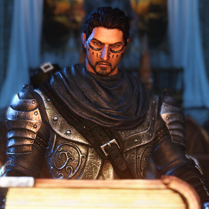 Saenus strikes an imposing figure despite his claims that he was never a proper soldier. He's tall and broad-shouldered, no doubt a result of his mixed lineage, but certainly leans more towards his mother's Imperial side. Dark hair curls around his temples, short and unkempt, framing thick black brows. He boasts gold eyes, something he'd state he got from his father, and is shared between every other Imperial bearing the name 'Frey'.