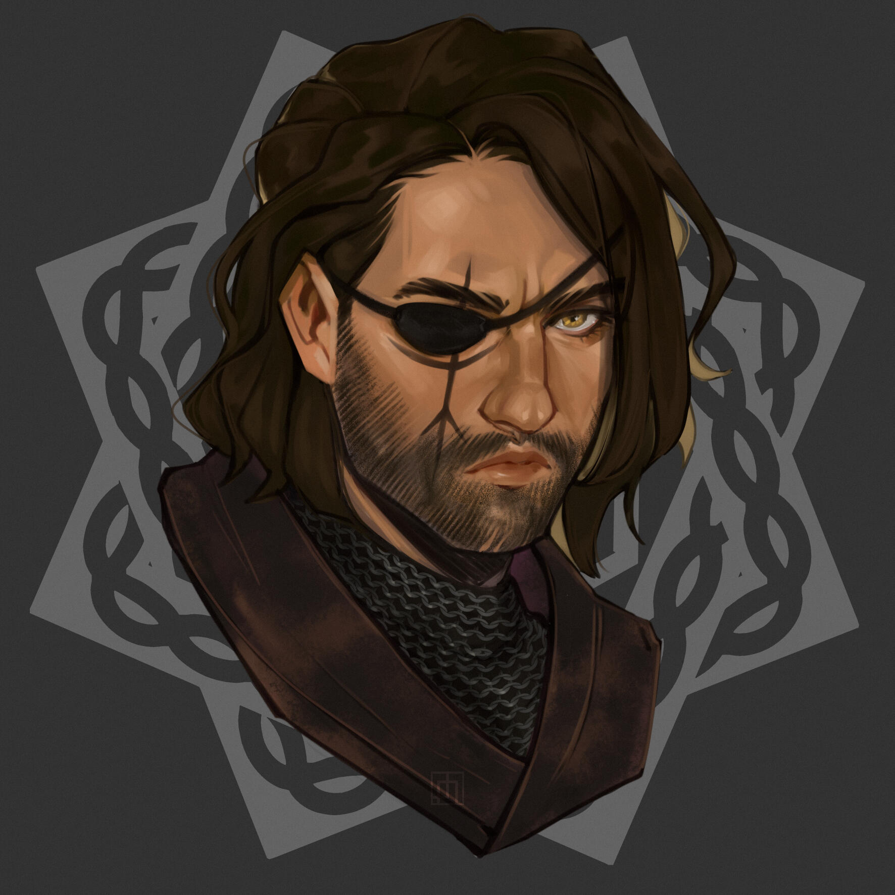 Saenus strikes an imposing figure despite his claims that he was never a proper soldier. He's tall and broad-shouldered, no doubt a result of his mixed lineage, but certainly leans more towards his mother's Imperial side. Dark hair curls around his temples, short and unkempt, framing thick black brows. He bears one strikingly gold eye, the other hidden away beneath an eyepatch, a black, scarred tattoo beneath it.